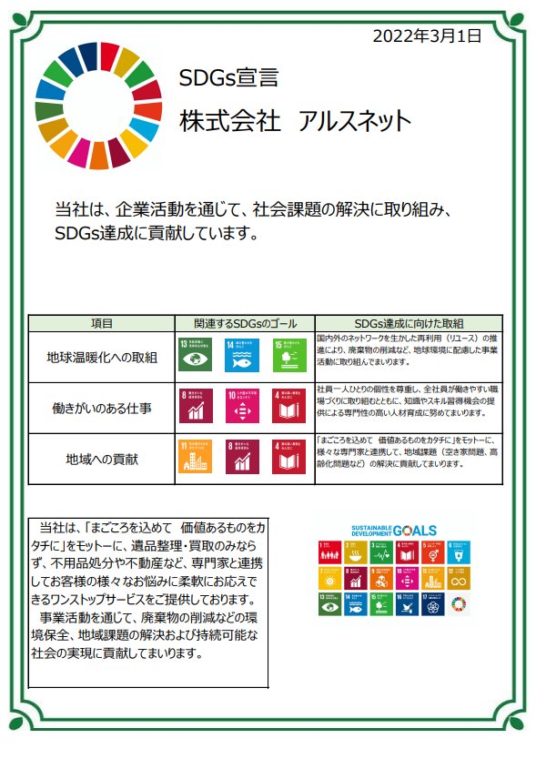 私たち株式会社アルスネットは、買取・リユースと廃棄物収集運搬を一体化した環境を護るワンストップ企業です。